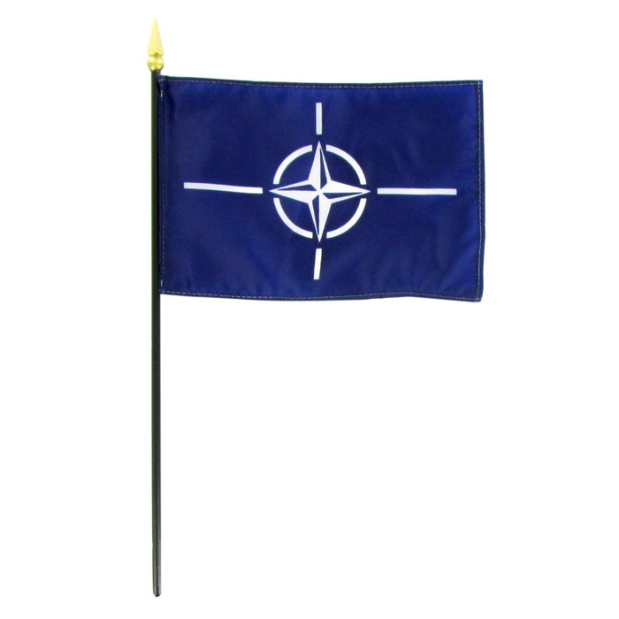 The flag of the North Atlantic Treaty Organisation consists of a navy blue flag with the white emblem of a compass rose with four white lines spreading out from it. Our international flags are accurately reproduced to exact specifications. The flag has 2 brass grommets on the left edge for hanging. The 4"x6" size is mounted to a staff with a spear top. Indoor or ceremonial version with a pole sleeve & gold fringe also available below.