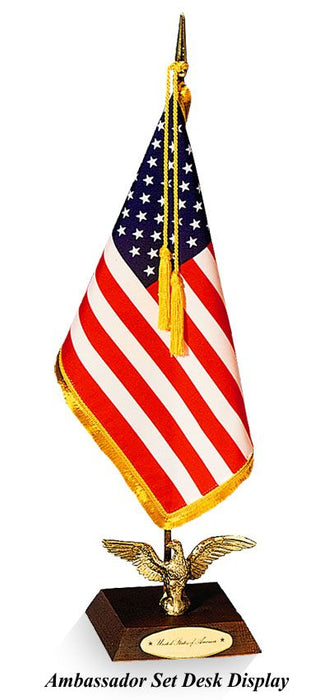 - The Ambassador Set features: 8"x12" Rayon printed American flag, gold spearhead ornament, 5" antique gold-plated eagle on the base.