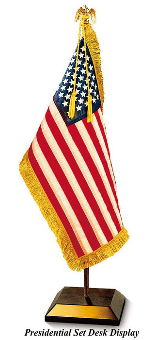 Our larger American Flag desktop indoor sets have a 8"x12" American flag with golden fringe, walnut finish wooden staff and base, and decorative golden cord and tassels.