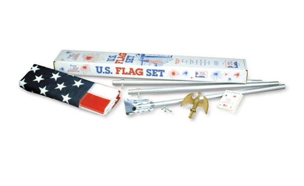 Our US flag kits come with everything you need! Including a 3-Piece 6' pole, 45 degree angle bracket, eagle top and 3'x5' flag.