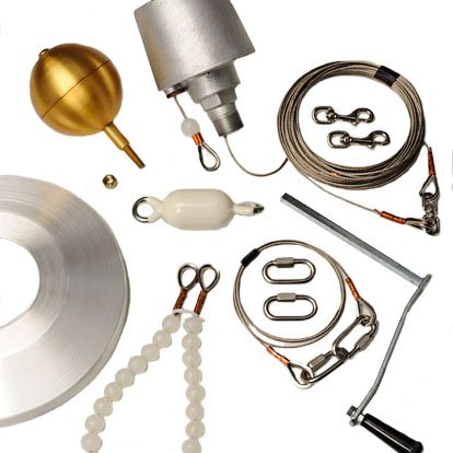 These deluxe internal halyard flagpoles contain a winch mounted inside the flagpole shaft, operable only with a removable crank handle. As the stainless steel cable unwinds from the winch, it passes up through the inside of the flagpole shaft, over the truck sheave to the outside of the shaft, where the retaining ring provides a sliding anchor. A counterweight, heavily coated with neoprene, attached to the retaining ring, allows the halyard to be lowered for fastening or removing the flag. The halyard is then raised completely out of reach of vandals.