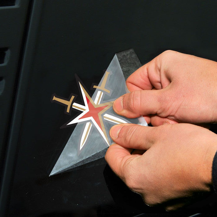 This set of two (2) Vegas Golden Knights licensed 4"x4" Die Cut decals are made of outdoor vinyl, permanent adhesive, image cut to the outside dimension of logo, full color detail is printed with a 3 year outdoor rating. Supplied with a clear liner, clear transfer tape, and application instructions are on the back of the card and online.