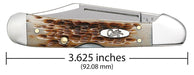 This Mini Copperlock® is a part of the Amber Bone Family. Our Amber Bone color and Peach Seed jig are signatures of the Case brand and the true heart of the case line. The Copperlock® knife is an original design by W.R. Case that combines elements from the Trapper and Copperhead to make a new lockback knife. The Mini Copperlock® is smaller than the traditional Copperlock® without compromising durability. With a fully locking Clip blade, this Mini Copperlock® knife has the cutting power of a lockback, with the look and feel of a traditional Case pocket knife. The Clip blade is commonly used as a multi-purpose blade that makes this pocket knife great for everyday use. This knife is constructed with Case Tru-Sharp™stainless steel which is a special high-carbon steel that helps the blades hold an edge longer than conventional steel. It also offers extraordinary blade strength and corrosion resistance. Comes conveniently packaged in a box. Made in Bradford, PA, USA from domestic and imported materials. Case Item # 00133