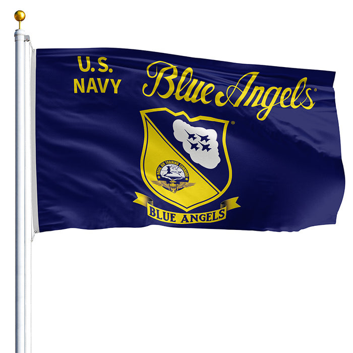 SIZE: 3'x5' Show your spirit with this officially licensed 3'x5' U.S. Navy Blue Angels flag, bursting with vibrant colors on durable nylon. It comes with strong brass grommets, perfect for soaring high wherever you hang it. Made with pride right here in the USA!