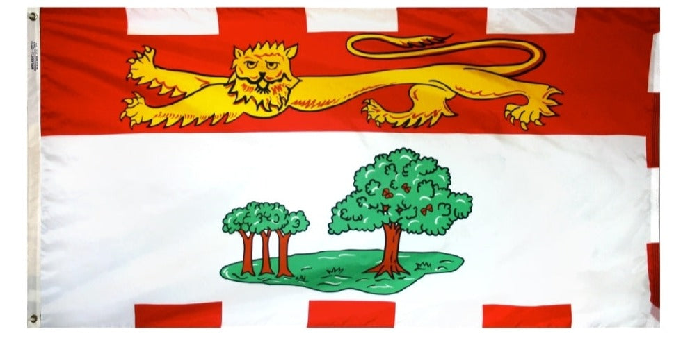 Size: 3'x6' The flag of Prince Edward Island, Canada is a banner modelled after the provincial arms. The three sides away from the mast are bordered by alternating bands of red and white. The upper third of the flag features the English heraldic lion which appeared both on the coat of arms of Prince Edward, Duke of Kent, for whom the province is named, and on that of King Edward VII. The lower two-thirds show an island on which appear three small oak saplings (on the left) – representing the three counties of PEI (Prince, Queens, and Kings) – under the protection of a great oak tree which originally represented Great Britain. Our Canadian Province flags are made to the official size of 3'x6'. These flags are made from durable nylon material, designed to last!