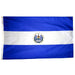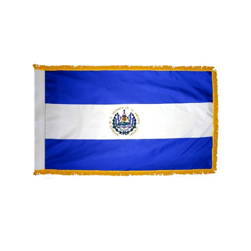 Our El Salvador Flags from Flags Unlimited are available in sizes from 4 inches by 6 inches up to 5 feet by 8 feet. We offer the El Salvador Flag in Durable Nylon material or Budget Polyester material. Indoor El Salvador flags with a pole sleeve and gold fringe are also available, along with Vinyl Decals and Embroidered patches.