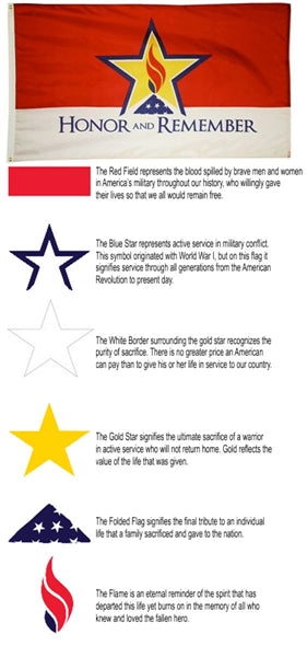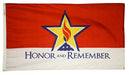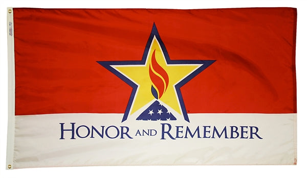 The Honor and Remember Flag was created to serve as a national symbol that specifically acknowledges the sacrifice of men and women in the United States Armed Forces who have given their lives for their country in over two centuries of America's history. Made from durable nylon material, the 2'x3', 3'x5' and 4'x6' flags feature (2) brass grommets, while the 4"x6" size is mounted to a 10" staff.