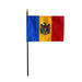 The national flag of Moldova is a tricolor of blue (hoist), yellow (centre) and red (fly) (ie. from left to right). It also features the Moldavian coat-of-arms (eagle holding shield with image of an aurochs). Our international flags are accurately reproduced to exact specifications. The flag has 2 brass grommets on the left edge for hanging. The 4"x6" size is mounted to a staff with a spear top. Also available below is an indoor/ceremonial version of the flag with a pole sleeve and gold fringe.