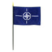 The flag of the North Atlantic Treaty Organisation consists of a navy blue flag with the white emblem of a compass rose with four white lines spreading out from it. Our international flags are accurately reproduced to exact specifications. The flag has 2 brass grommets on the left edge for hanging. The 4"x6" size is mounted to a staff with a spear top. Indoor or ceremonial version with a pole sleeve & gold fringe also available below.