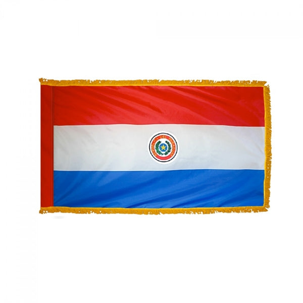 Our Paraguay Flags from Flags Unlimited are available in sizes from 4 inches by 6 inches up to 5 feet by 8 feet. We offer the Paraguay Flag in Durable Nylon material or Budget Polyester material. Indoor Paraguay flags with a pole sleeve and gold fringe are also available, along with Vinyl Decals.