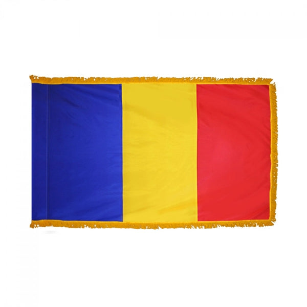 Our Romania Flags from Flags Unlimited are available in sizes from 4 inches by 6 inches up to 5 feet by 8 feet. We offer the Romania Flag in Durable Nylon material or Budget Polyester material. Indoor Romania flags with a pole sleeve and gold fringe are also available, along with Vinyl Decals.