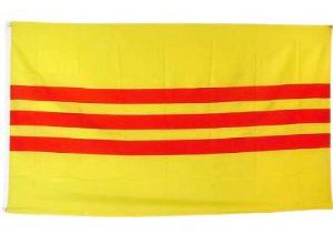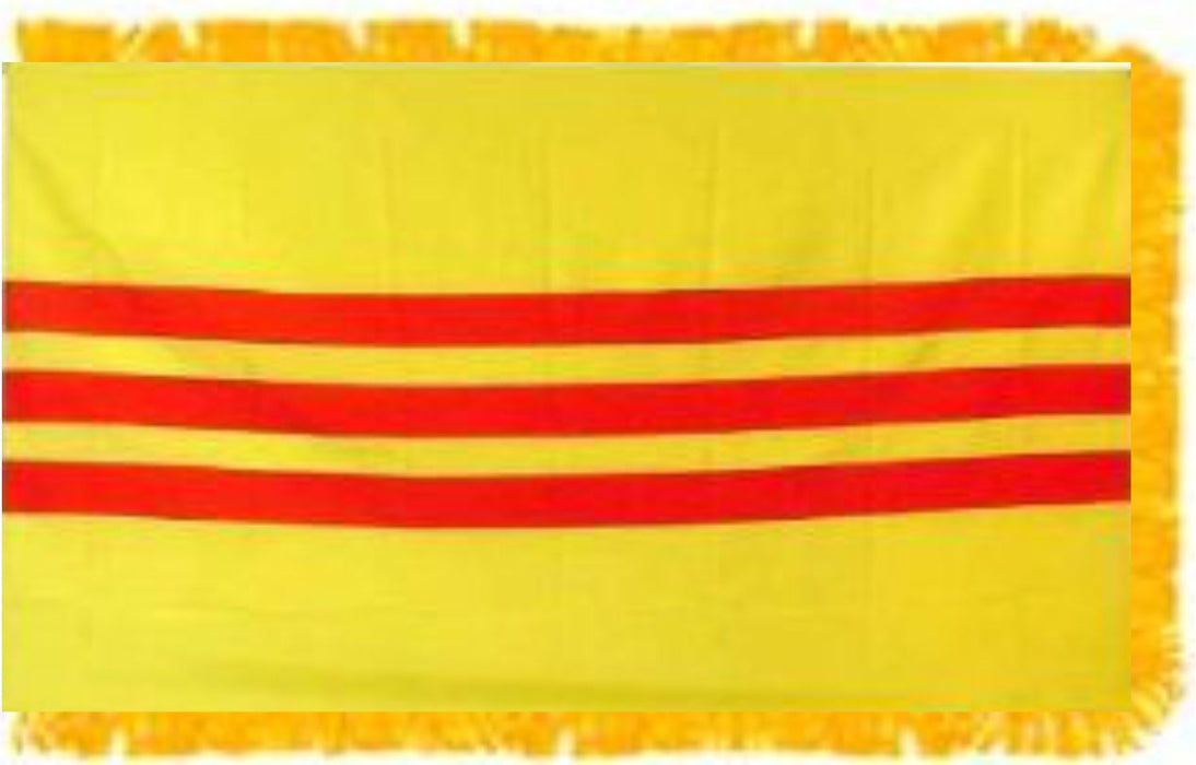 The flag of former South Vietnam was designed by Emperor Bảo Ðại in 1948, and was the flag used by former South Vietnam until it was abolished by Vietnamese government on April 30, 1975, when the South unconditionally surrendered to the North. It is also used by some Vietnamese immigrants now living in other countries.The flag consists of a yellow field and three horizontal red stripes that represent North, Central and Southern Vietnam. Our international flags are accurately reproduced to exact specifications. The flag has 2 brass grommets on the left edge for hanging. The 4"x6" size is mounted to a staff with a spear top. Polyester flags are imported and not recommended for prolonged outdoor use. For outdoor use, we recommend our nylon flags. Also available below is an indoor/ceremonial version of the flag with a pole sleeve and gold fringe.