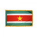 Our Suriname Flags from Flags Unlimited are available in sizes from 4 inches by 6 inches up to 5 feet by 8 feet. We offer the Suriname Flag in Durable Nylon material or Budget Polyester material. Indoor Suriname flags with a pole sleeve and gold fringe are also available.