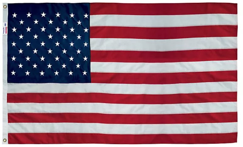 • 3' x 5' Nylon U.S. flag with sewn stripes, embroidered stars and brass grommets
